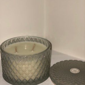 Sand + Fog Vanilla Sandalwood scented candle in a green glass jar with a wood lid 10 ounces