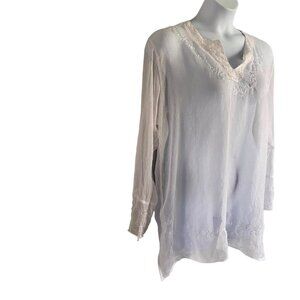 Sand N Sun Sheer White Long Sleeve Swim Cover Up. Light and breezy, 100% Polyester. Size 1X with Approximate measurements laying flat: 24" pit to pit, 34" length, 23" sleeve length..