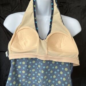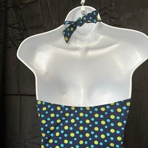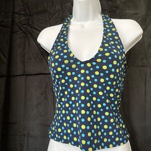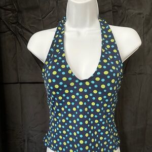 Sand N Sun, tankini top, dark blue with lime green and aqua blue polka dots, ties at neck, elastic back, built in bra, 87% nylon, 13% spandex, lining is 100% polyester, size S, good condition