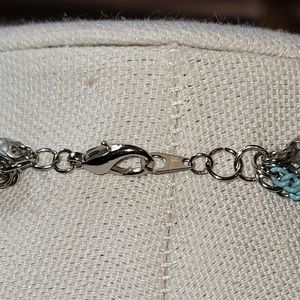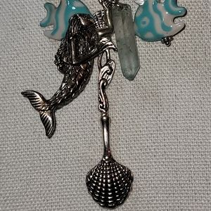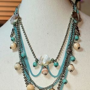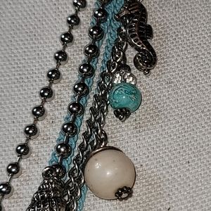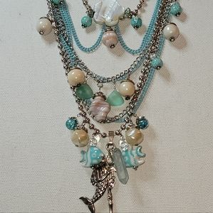 "Sand & Sea" is perfectly named for this muli-Chained, multi-layered single Necklace that draws its colors of the tourquoise blue from the Caribbean Sea and soft tans from its pristine Shoreline. Several Chains in silver and tourquoise blend to form 4 tiers, like the illusion of wearing 4 necklaces! The 1st tier is 19"L w/1.25" drop. 2nd tier is 24"L w/1.25" drop. 3rd tier is 26"L and the 4th tier is 26.5"L w/3.25"L drop. All Chains join together with a silver Lobster Clasp closure in back. Many Beads & Charms adorn this piece, including pearlized ivory, crackled blue glass, silver Seahorses, Flower-shaped Shells, sand and ivory Beads, tourquoise and white glass Fish that are blowing out clear, irridescent, round, glass air bubbles, tourquoise Clam Shells, a silver Conch Shell, silver Spacers, crystal laden silver Bead Caps, an antique silver Mermaid, a silver Spoon pendant, and a pale blue Crystal Shard. Mermaids are avid collectors of beautiful, shiny whozits and whatzits! This necklace looks fabulous with almost anything you wear.