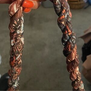 Chic woven straw tote featuring a vibrant tiered tropical design. Boho style, unique 16” straps with decorative knots, Ideal for Summer, Vacation & Resort-wear.
