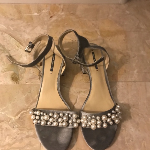 Slightly loved grey velvet ankle strap sandals with decorative pearls across the toe. Original box available.