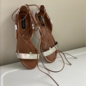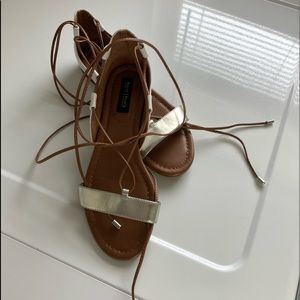 Sandal Flats Gladiator Size 6 Ankle Tie Flats White & Silver Preloved Gently