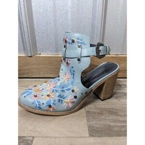 This is a trendy women's ankle boot sandal in a vibrant blue turquoise color with floral embroidery accents. It features a buckle-strap closure, high block heel, and bohemian style. The faux leather upper material adds a stylish touch, while the ankle strap and adjustable strap provide comfort and a secure fit. Perfect for adding a fashionable statement to your outfit in size 10.