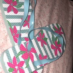 This is a nice slipper for the beach are any mini girls trip with the lavish color of blue with beautiful colored tropical flowers .