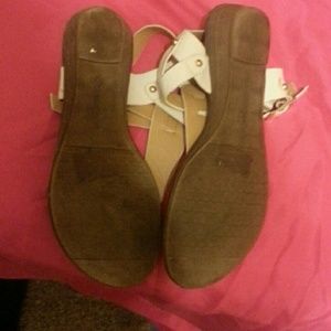 These sandals have a bit of a wedge , they are super cute , have some wear on the bottom but very comfy!