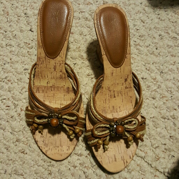 Brown cork heeled sandals with beading in front