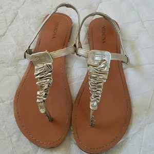 Cute gold sandals. There is some fraying on the straps as is shown in the pictures. Still in good condition!