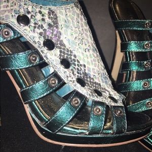 Metallic sandals with a snake skin feature on the front. Colors display a dark teal and purple reflection. Front of the show is a iridescent