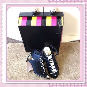 Black faux leather lace up sandals. 31/2" heel Worn 2 times. This 71/2 fits like a 7.