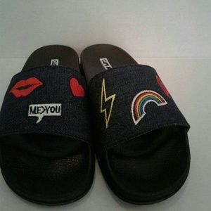 New Slide on flat sandals, upper jeans materials, man-made sole with embellishment on top.
