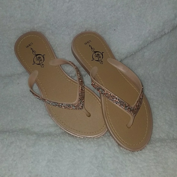 Brand new, sandals are tan with white and rose gold studs.
