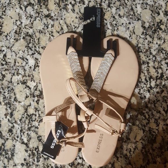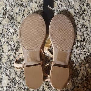 Tan and sparkly sandals, never worn. One gem missing on the right sandal, and a blemish on the sole of the right sandal