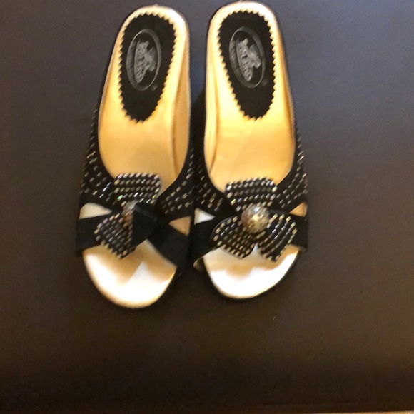 Beautiful in excellent condition black suede like wedge sandal.has stud details and now on shoe.about 2 inches on heel height.