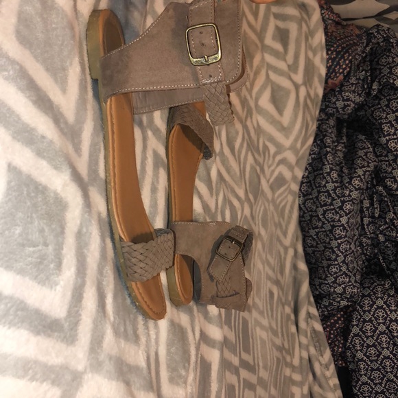 Brown, velvet feeling sandal, buckle, shoe size L 8/9 but they fit like 8.5