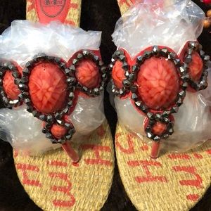 Beautiful Coral Colored Faux stone with Bronze crystal like stones surrounded around each large stone, Real Comfy thong type sandal.