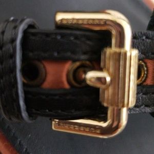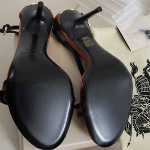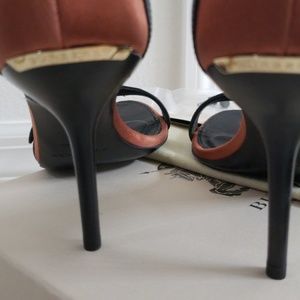 New T- Strap sandal with sm gold buckle black leather and satin salmon size 7 but it will fit to 7.5with a box and dust bag 3.5" Authentic