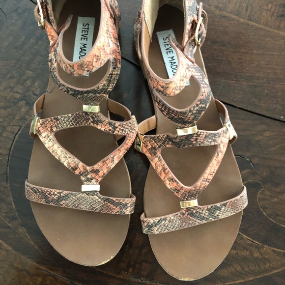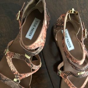 Lovely Steve Madden sandals. Heel slightly worn but not very noticeable. Top of sandal I excellent condition.