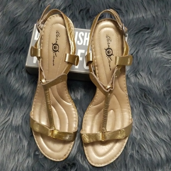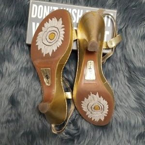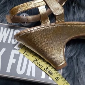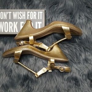 Super Cute Sandals, in rich gold color, perfect for summer. Gently worn, tiny black mark to front of (R), but your toes will cover it, in good condition.