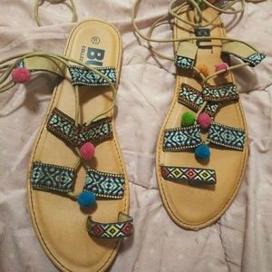 Multicolor gladiator sandals that wraps around ankle/calf's. Has colorful puffs and beads