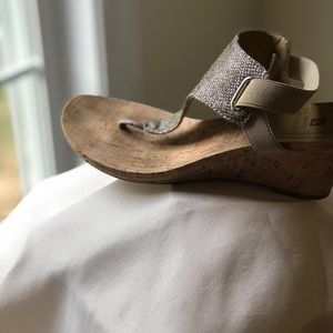 Thong sandals, wedge heels with elastic back strap. Very cute with capris, shorts, skirts and dresses. Used but in good condition.