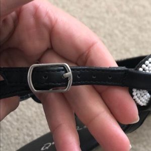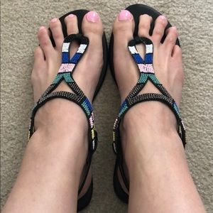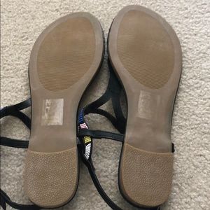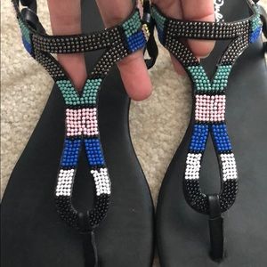 Qupid Sandals. Size 9. Worn for this picture. Beaded. Colors: black, white, pink, yellow, royal blue, teal.