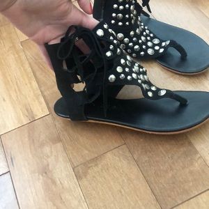 Black sandals, soft top embroidered with silver designs, lace up side with zipper on other. super cute with any outfit choice!!