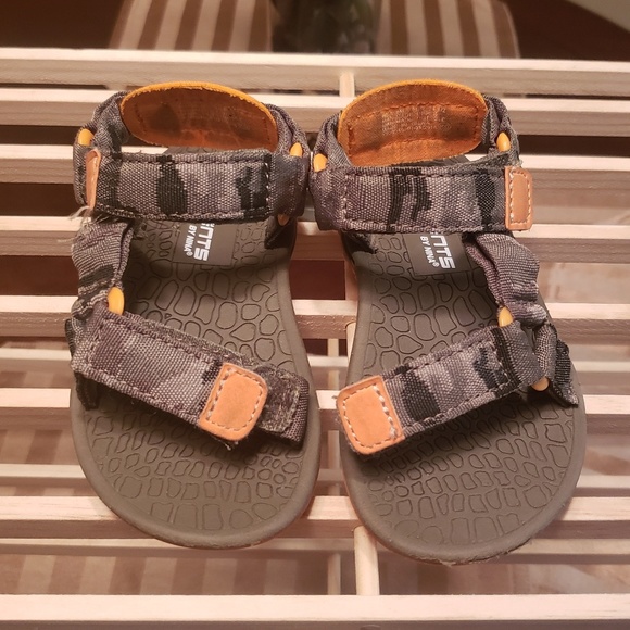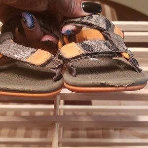 Camouflage trimmed in orange sandal. Velcro fastener. Toddler 8 in size. Gently worn. Good condition!