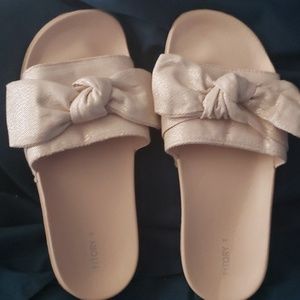 Light pink with rose/gold bow slider sandals. Size 5/6 small