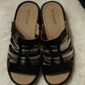 New. All man made materials. Black, gold, and silver. They read size 6 1/2, but fit like a 7W.