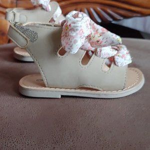Soft light brown / beige sandals with a floral material lace. Hard leather soles. The back has a velcro closure above the heel.