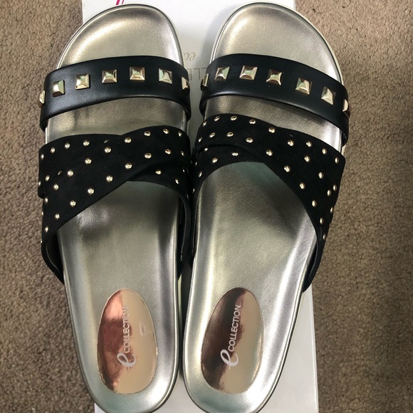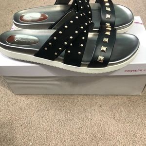 easy spirit slide sandals, black with gold studs, worn once, great condition