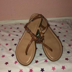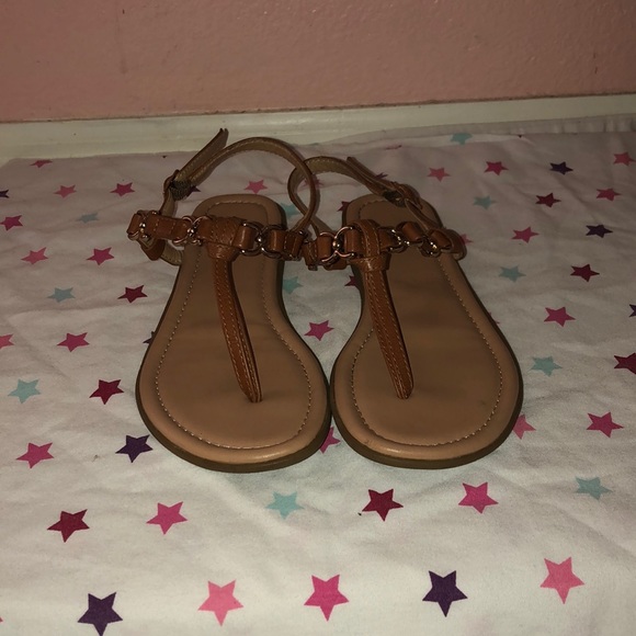 Brown, gold metal, sandals.