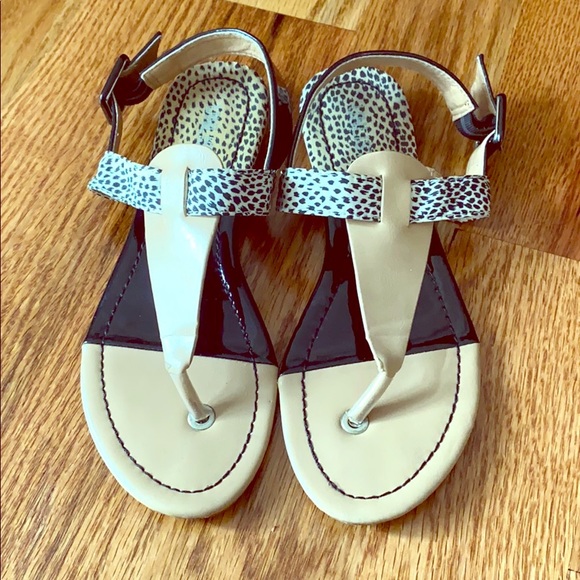 Unlisted sandals. Black strap and cream with animal print.