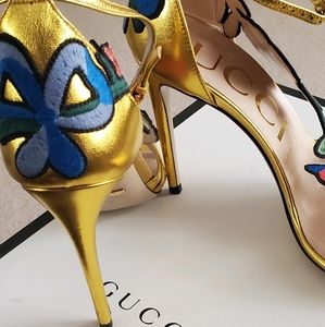 Gold Leather Gucci Ankle strap sandal with stitched flowers. Flowers going across top of foot and stitched bow in the back. Heel 4 inches. Gold Gucci Plate on sole. Worn once. Box and duster bag and card included.