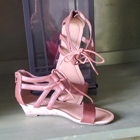 Tiny heeled sandals. Zip on heel, tie front. Perfect pair with rompers or sundress.