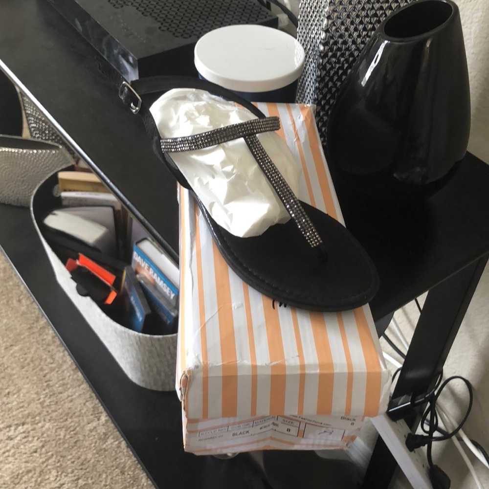 Black, flat, thong sandals with ankle strap. Never been worn still in original box and recently purchased but didn’t fit me.