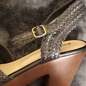 Black upper with wood lower sandal New only tried on inside once. Does have a small scratch as shown in one of the pictures.