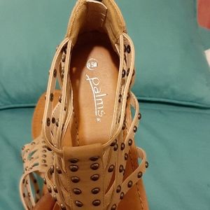 NWT never worn. Tan PALMS sandals, synthetic upper, cushioned comfort insole with a thong construction, back zipper closure, rhinestone accent. No pets, non smoking household.