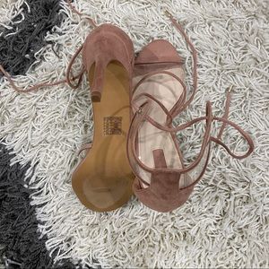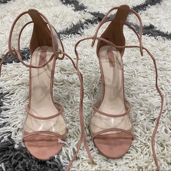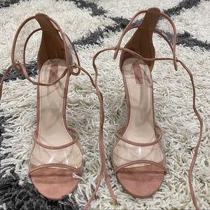 Mauve color Perspex stiletto heels with ankle tie detail. Strap around the toes. 4 inch heels