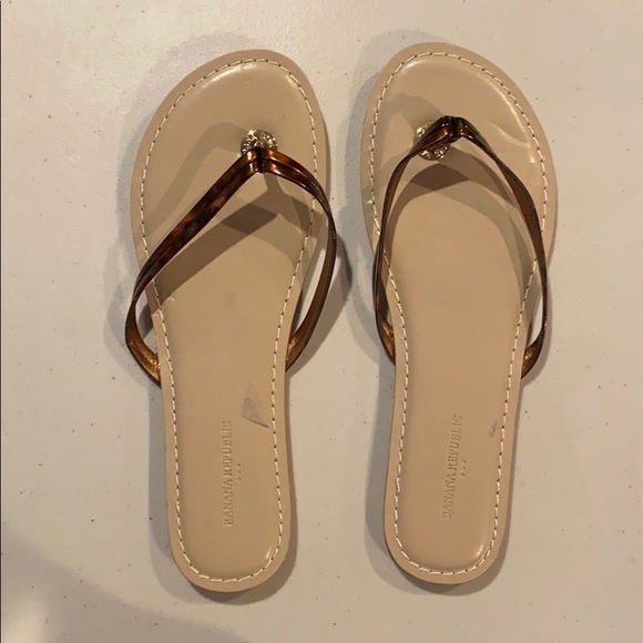 Tan sandals with bronze strap. Small black scuffs on the heel area