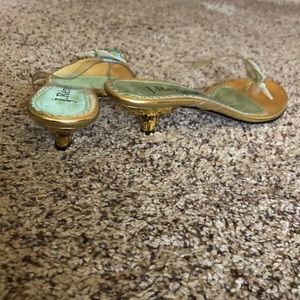 Low heeled sandals with Rhinestone fish. Clear strap. Lightly worn. Metallic gold heel.