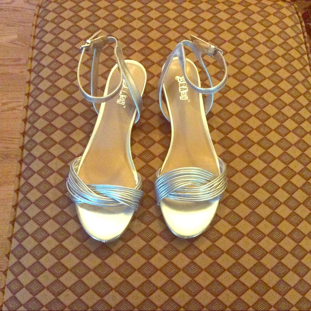 Only worn once 1" heels. Wear with jeans,shorts etc.. comfortable silver braid and back has elastic so will give.