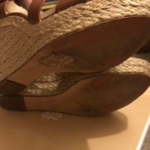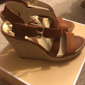 Beautiful michael kors giovanna wedge. Perfeft tan color that goes with everything. The most comfortable sandal. Worn but in great condition.