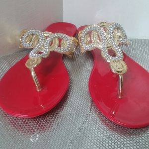 Ladies sandals red bottoms w/gold & silver bling on top new condition very pretty