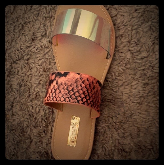 Brand new sandals with one pinkish orange python print and one iridescent strap