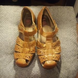 Brown closed-toe sandals with intricate designs on the strips of leather. Worn and used.