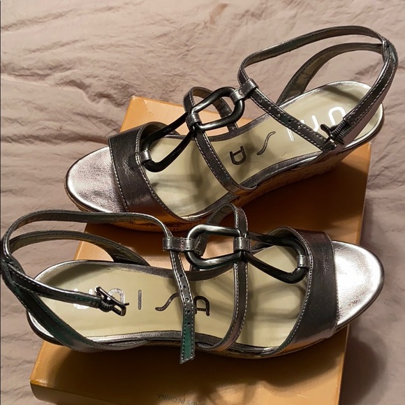 Like new sandals. Worn once. Wedge/cork. Comes in original box. Pewter
