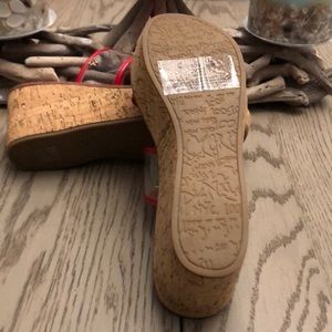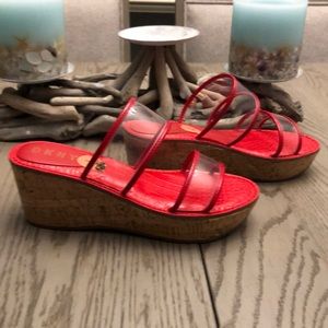 Super cute pair of DKNY sandals. Clear bands trimmed in red, cork heels with a little silver DKNY emblem on the side of each sandal. New without box. Feel free to ask questions! All offers welcome :)