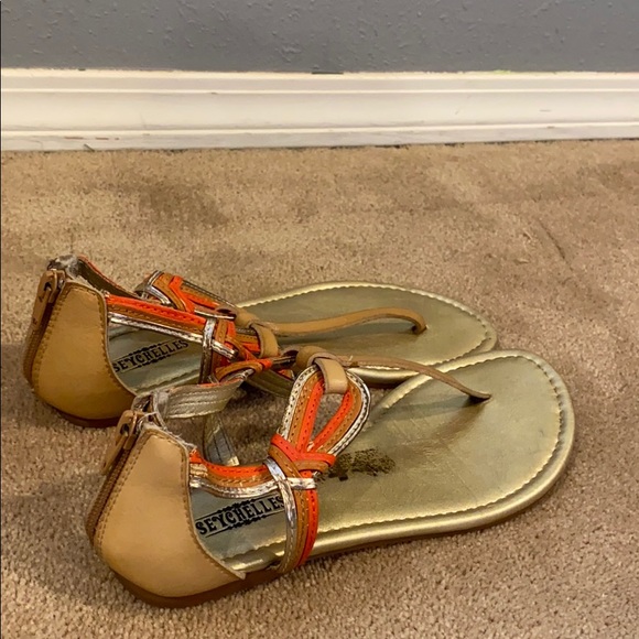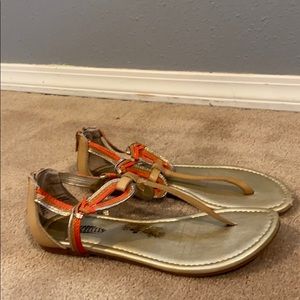Brown and orange Sandals! Really cute and comfortable just never wear them due to weather! Women’s size 6.5. The brown spot on the right shoe is just from the price sticker!